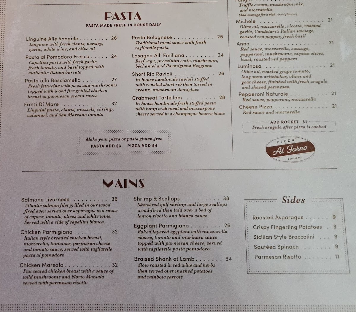 Black truffle créme, mozzarella, seasonal mushrooms (add sausage because it’s awesome.)