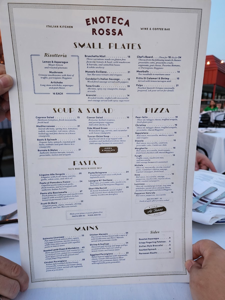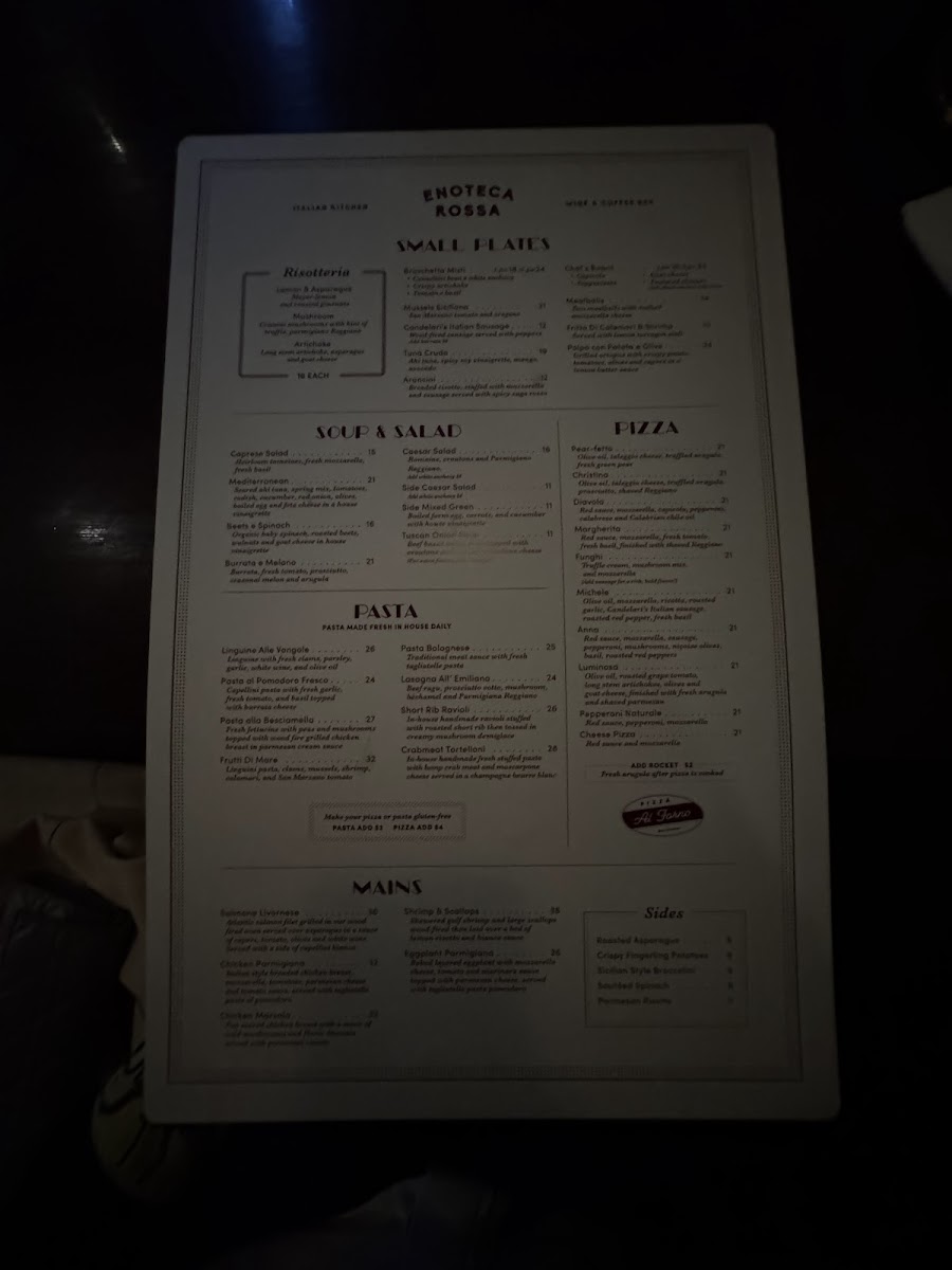 Red sauce, mozzarella, anchovy, capers, finished with arugula and shaved Reggiano